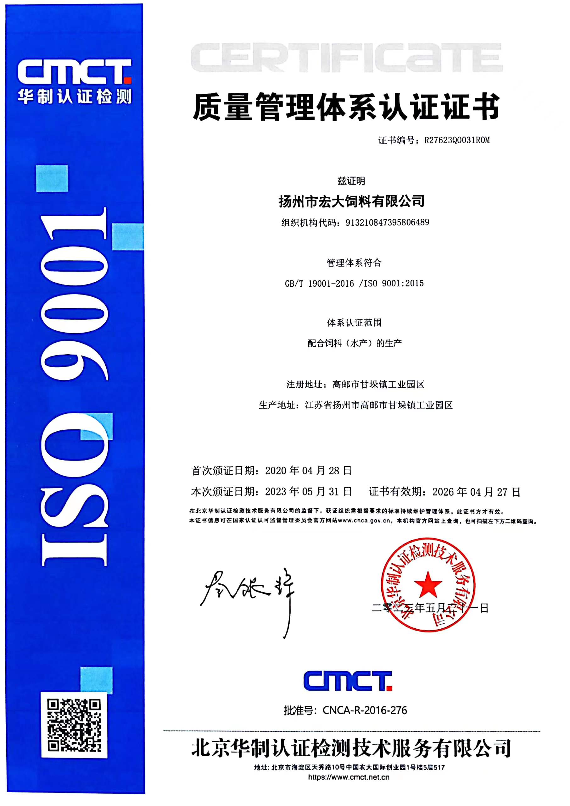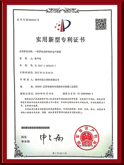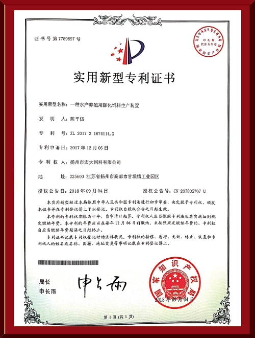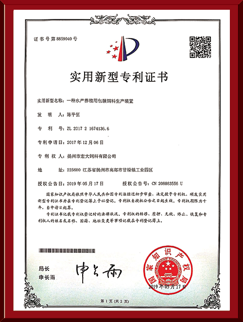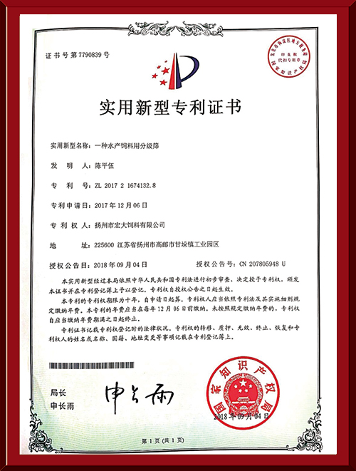 揚州市宏大飼料有限公司 揚州市宏大飼料有限公司是一家集科研與生產(chǎn)為一體的大型民營企業(yè),座落在魚米之鄉(xiāng)高郵東郊,傍依郵興公路、澄子河,水陸交通便捷,于2002年建成投產(chǎn),占地面積60畝,固定投資1.5億元。現(xiàn)有7條生產(chǎn)線,其中時產(chǎn)15噸高檔水產(chǎn)膨化生產(chǎn)線2條,均采用國內(nèi)先進的真空后噴涂技術(shù)和低溫烘干技術(shù)(飼料內(nèi)的各種營養(yǎng)不受破損)、臺灣宜大高檔蝦料生產(chǎn)線2條和魚飼料生產(chǎn)線3條。